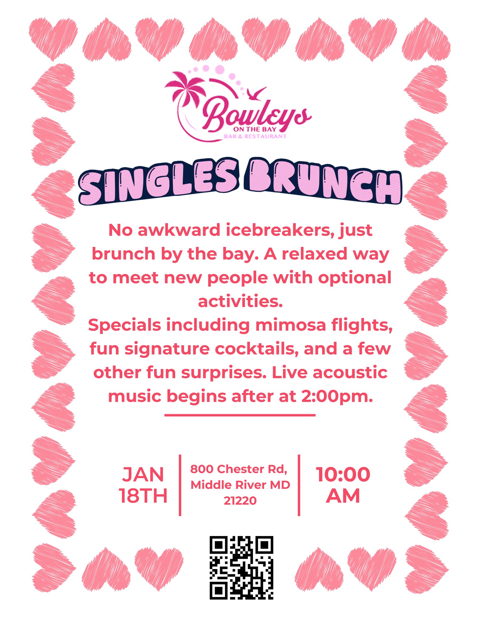 Enjoy mimosa flights, fun signature cocktails, and a few surprises, with optional activities if you’re feeling social. Stick around as live acoustic music begins at 2pm and turn brunch into an easy afternoon by the water.
